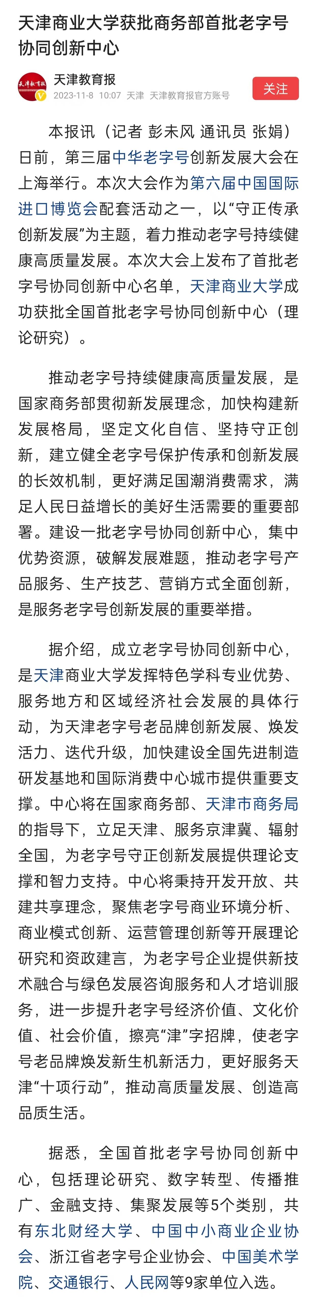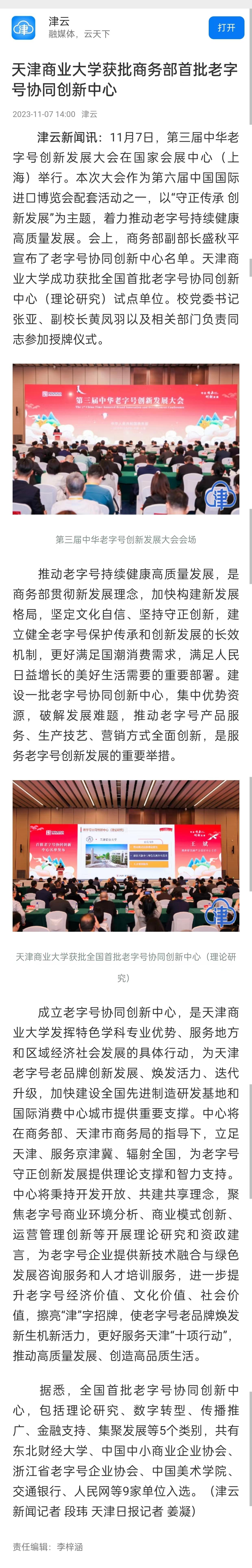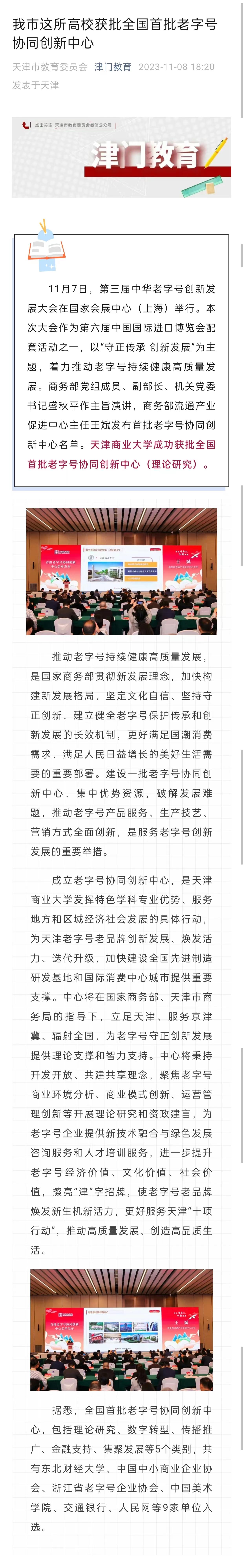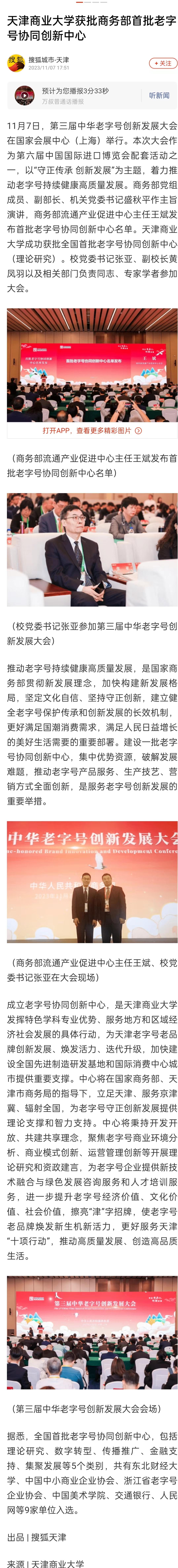 11月7日至8日,中国日报网、津云、《天津教育报》头条号、搜狐网、津门教育微信公众号报道星空获批商务部首批老字号协同创新中心。日前,第三届中华老字号创新发展大会在上海举行。本次大会作为第六届中国国际进口博览会配套活动之一,以“守正传承 创新发展”为主题,着力推动老字号持续健康高质量发展。本次大会上发布了首批老字号协同创新中心名单,星空XK体育成功获批全国首批老字号协同创新中心(理论研究)。