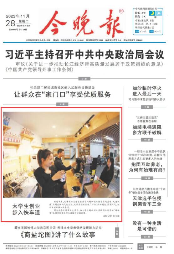 11月28日,《今晚报》头版报道学校星空微渡众创空间“遇咖啡”休闲空间。