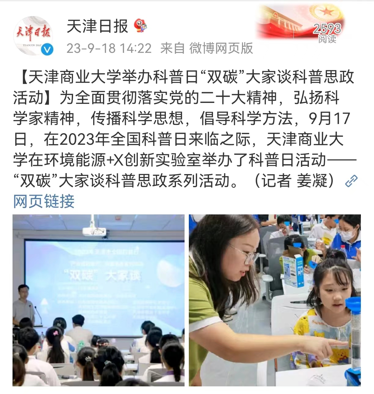 《天津日报》微博、津云报道学校举办科普日“双碳”大家谈科普思政活动