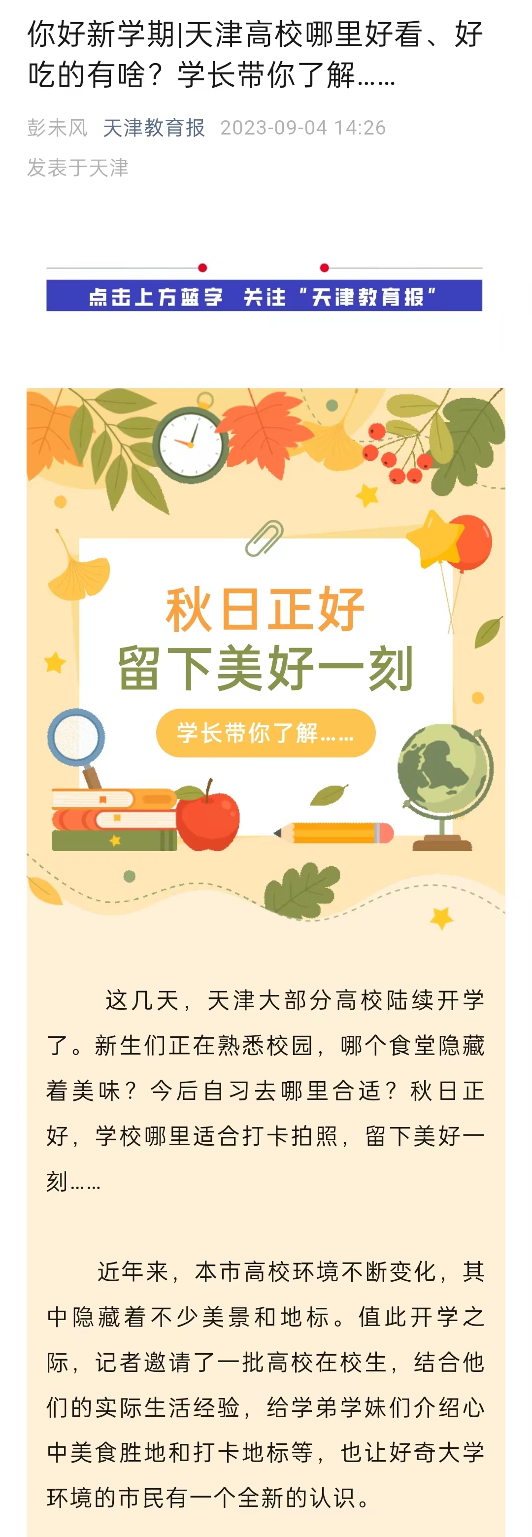 9月4日。《天津教育报》微信公众号以“你好新学期|天津高校哪里好看、好吃的有啥?学长带你了解……”为题报道星空学生向新生介绍特色美食和打卡地标。