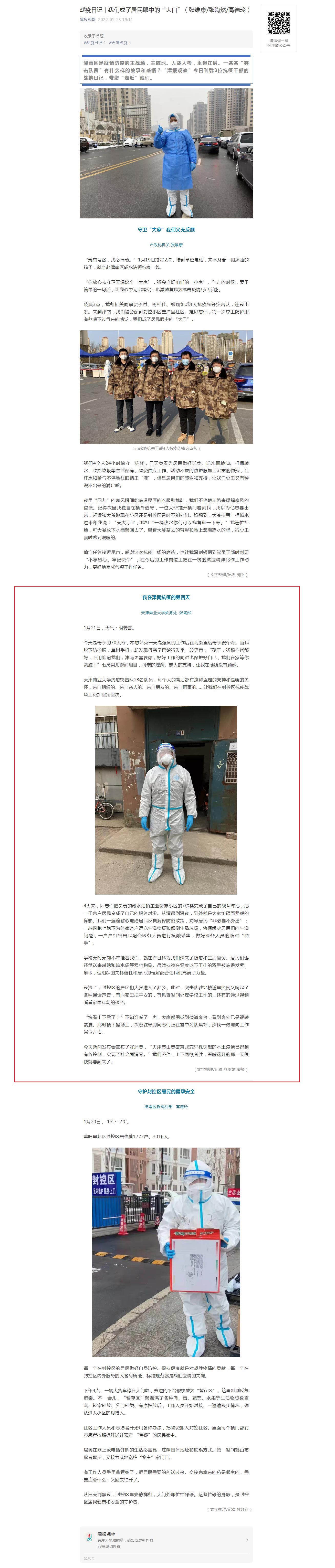 1月23日,津报观察公众号以“战役日记| 我们成了居民眼中的‘大白’”为题,报道了星空在津南抗疫一线干部张陶然的抗疫日记。