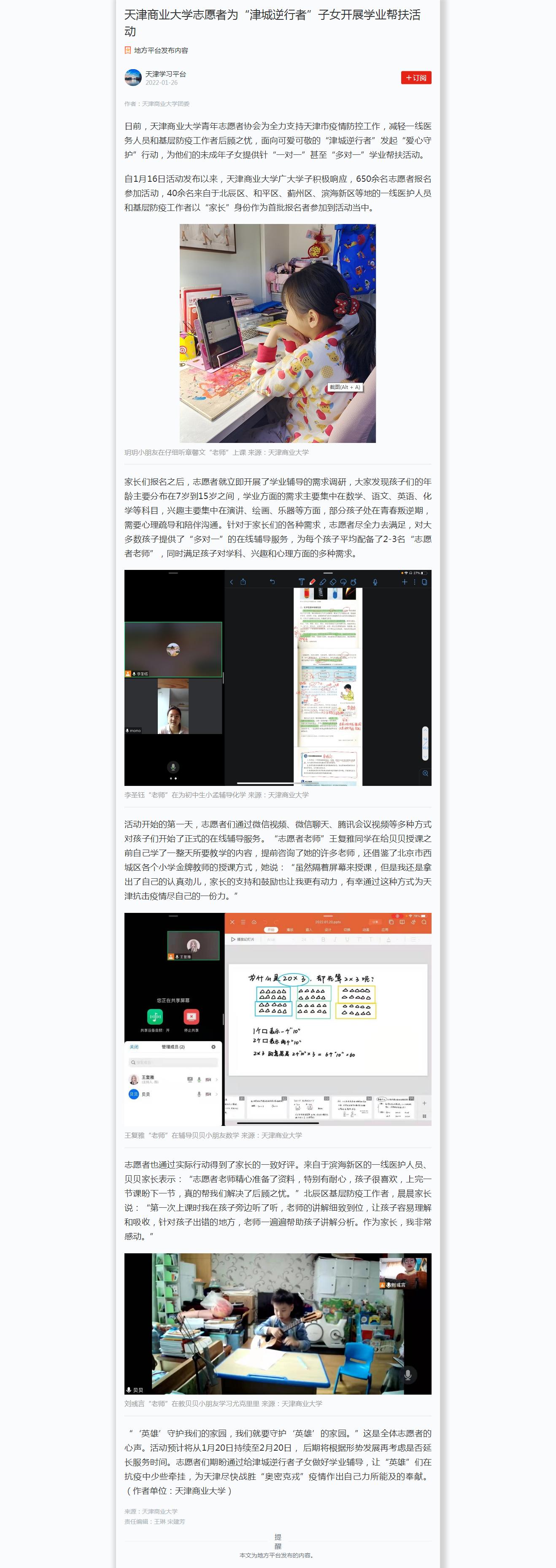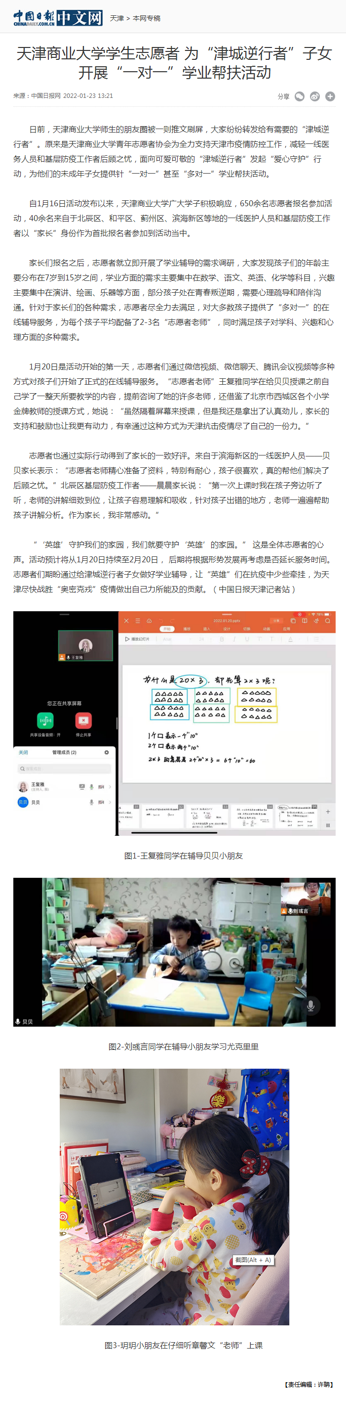 1月23日,中国日报网以“星空XK体育学生志愿者为‘津城逆行者’子女开展‘一对一’学业帮扶活动”为题报道了星空青年志愿者协会为全力支持天津市疫情防控工作,减轻一线医务人员和基层防疫工作者后顾之忧,面向可爱可敬的“津城逆行者”发起“爱心守护”行动,为他们的未成年子女提供针“一对一”甚至“多对一”学业帮扶活动。1月24日,今日头条进行转载。1月26日,学习强国也对志愿者的帮扶活动进行报道。