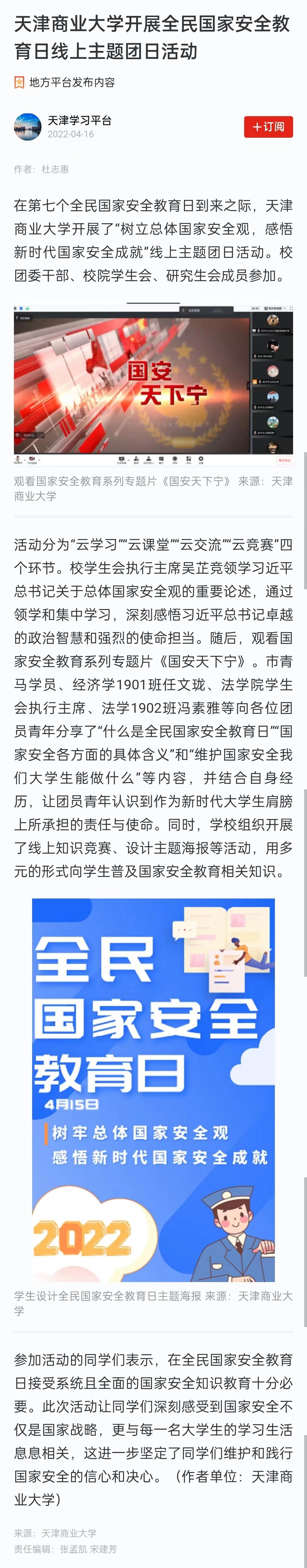 4月16日,学习强国天津平台报道星空开展了“树立总体国家安全观,感悟新时代国家安全成就”线上主题团日活动。