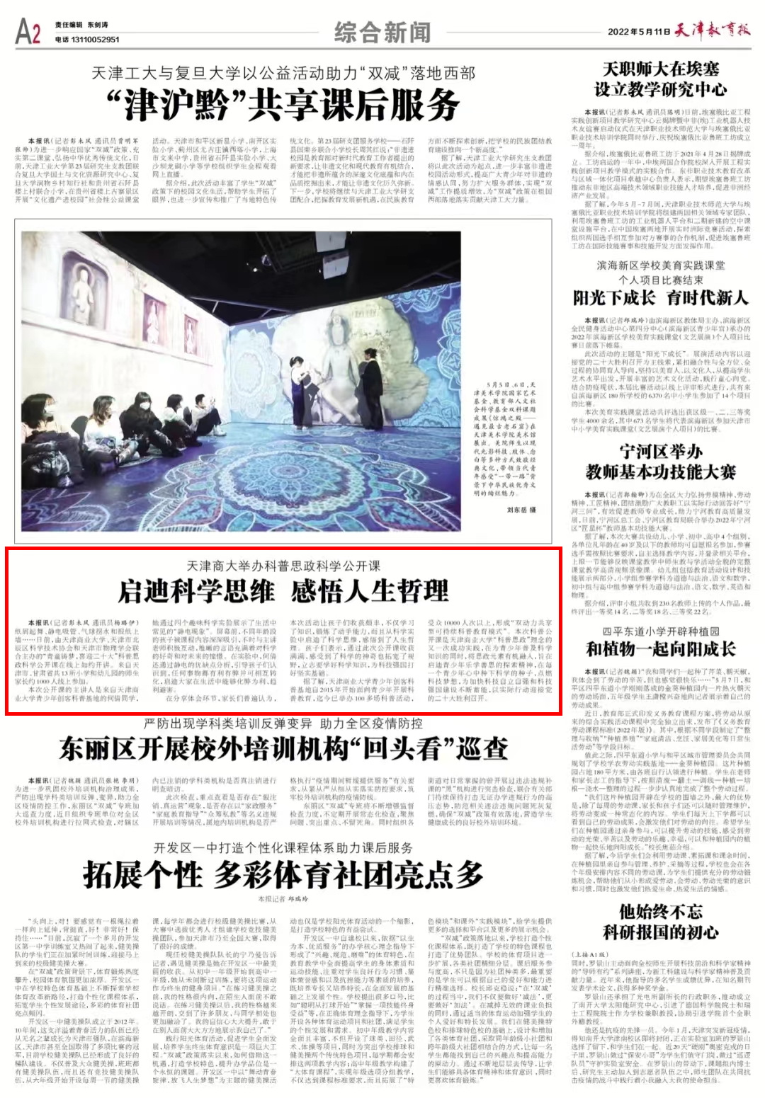 5月11日,《天津教育报》报道星空、天津市北辰区科学技术协会和天津市物理学会联合主办的“青童铸梦,喜迎二十大”科普思政科学公开课在线上如约开讲。