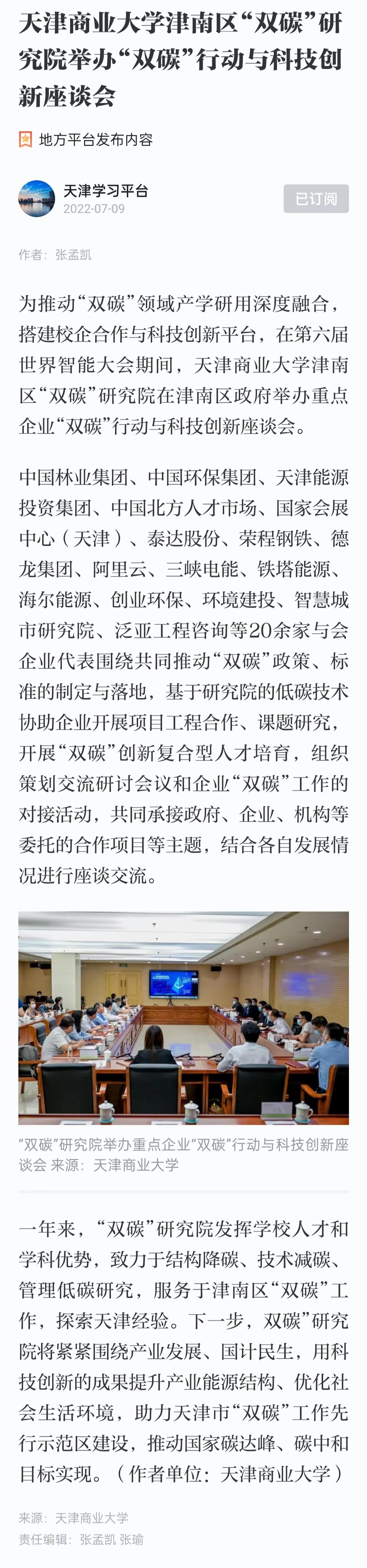 6月26日,津云客户端报道“双碳”研究院举办重点企业“双碳”行动与科技创新座谈会。