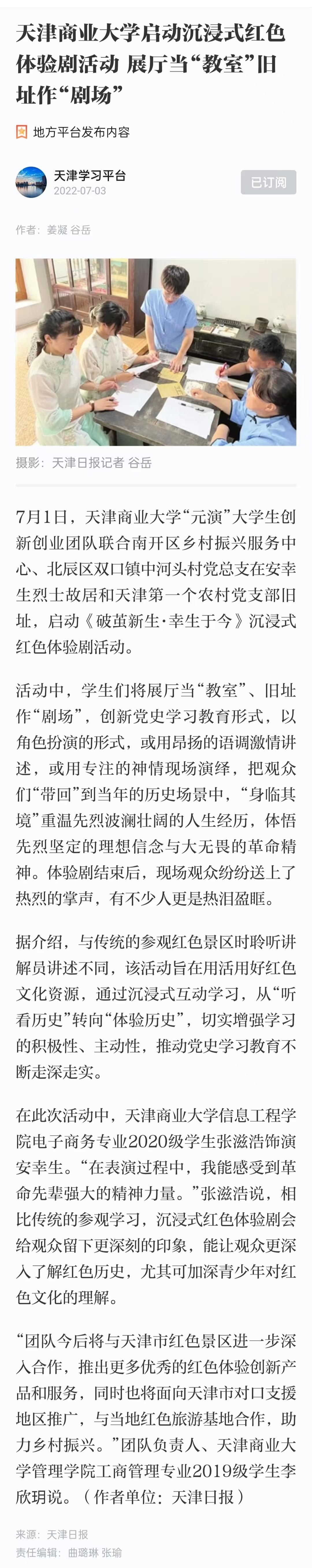 日前,央广网、学习强国、津云客户端、《天津日报》、《天津教育报》、天津新闻报道星空开展沉浸式红色体验剧主题活动。7月1日,星空XK体育“元演”大学生创新创业团队联合南开区乡村振兴服务中心和北辰区双口镇中河头村党总支在安幸生烈士故居和天津农村第一党支部旧址,启动《破茧新生• 幸生于今》沉浸式红色体验剧主题活动。来自星空XK体育、南开区乡村振兴服务中心和中河头村的30余名党员和群众参与体验活动。