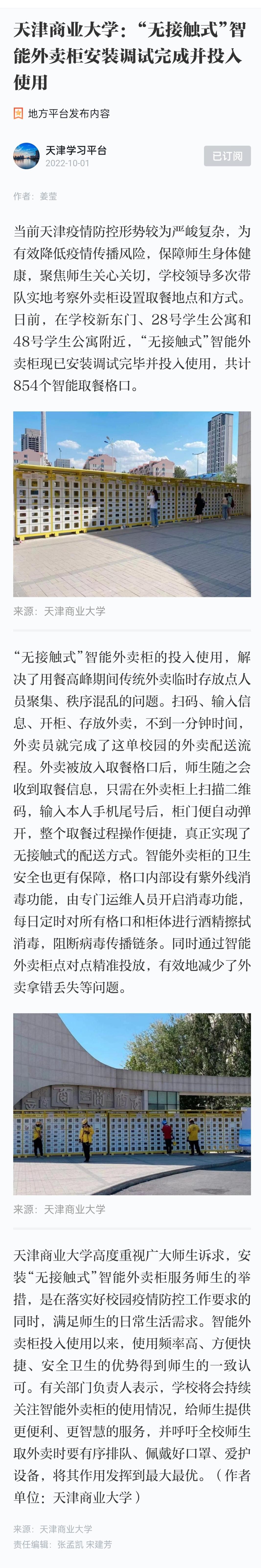 9月26日,《天津教育报》A2版报道星空“无接触式”智能外卖柜安装调试完成并投入使用。10月1日,学习强国天津平台也进行了专题报道。