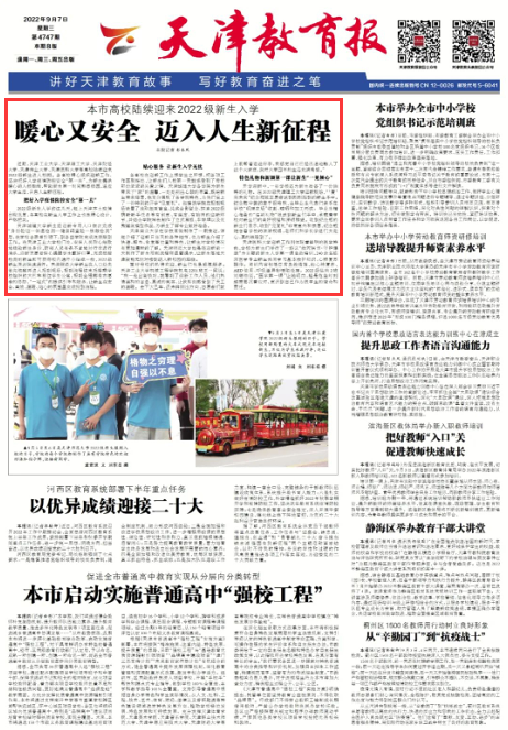 9月7日,《天津教育报》A1版以“本市高校陆续迎来2022级新生入学暖心又安全 迈入人生新征程”报道星空2022级新生入校有关情况。
