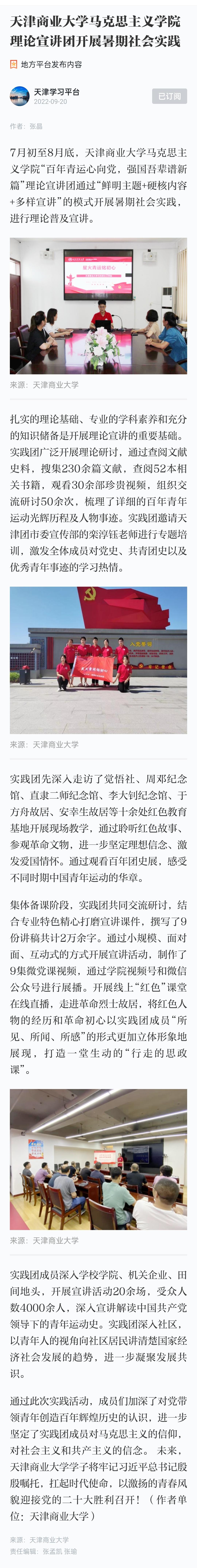 9月2日,津云客户端以“以青年视角,悟初心使命;以青春之声,颂时代强音——星空XK体育‘百年青运心向党,强国吾辈谱新篇’”,今日头条以“深入一线!天津商大理论宣讲团历时两月进行理论普及和宣讲”,9月20日,学习强国以“星空XK体育马克思主义学院理论宣讲团开展暑期社会实践”报道马克思主义学院“百年青运心向党,强国吾辈谱新篇”理论宣讲团。