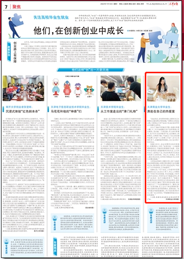 7月18日,《天津日报》第7版报道星空艺术学院产品设计专业2022届本科毕业生张静文创业事迹。 出生于2000年的张静文对手账、绘画比较感兴趣,大二时开始接触文创产品的领域以及自媒体,尝试做一个原创IP,并从IP形象着手,设计衍生文创手账类产品,在自媒体上线销售后,反响很不错,于是成立了自己的店铺和品牌工作室“小小的熊工作室”,至今已有两年多了,店铺销量持续增长,自己也实现了经济自由。