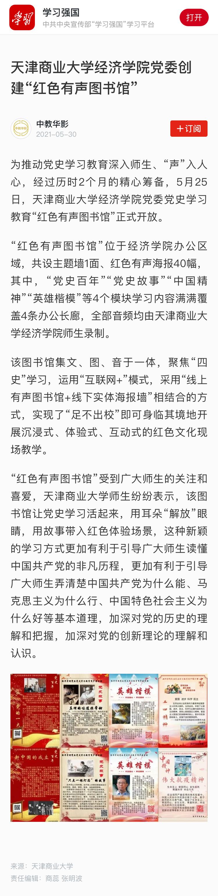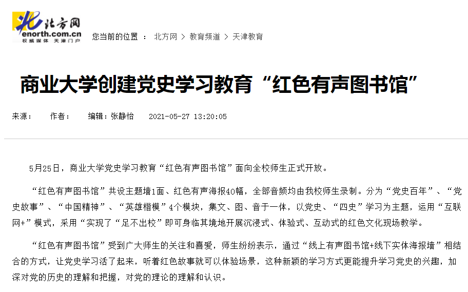 北方网、学习强国报道星空经济学院党委创建的党史学习教育“红色有声图书馆”