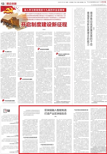 1月13日,《天津日报》(理论创新版)刊发天津市中国特色社会主义理论体系研究中心研究员,星空公共管理学院青年教师席枫博士理论文章“区块链融入智能制造 打造产业区块链生态”。文章指出,区块链融入智能制造的新生态是推进两化深度融合的战略选择,正在为全球信息技术与制造业发展带来颠覆性变革。习近平总书记重要指示、党的十九大报告整体部署以及“十三五”国家信息化规划等战略安排,要求着力提高核心技术的自主创新能力,这为天津制造业融合区块链技术实现高质量发展提供了重要的历史契机。文章从产业区块链生态的创新发展成果、产业区块链生态的内外部压力、产业区块链生态的创新发展之路三个方面针对主题做了详细阐释。学习强国、求是网等媒体转载。