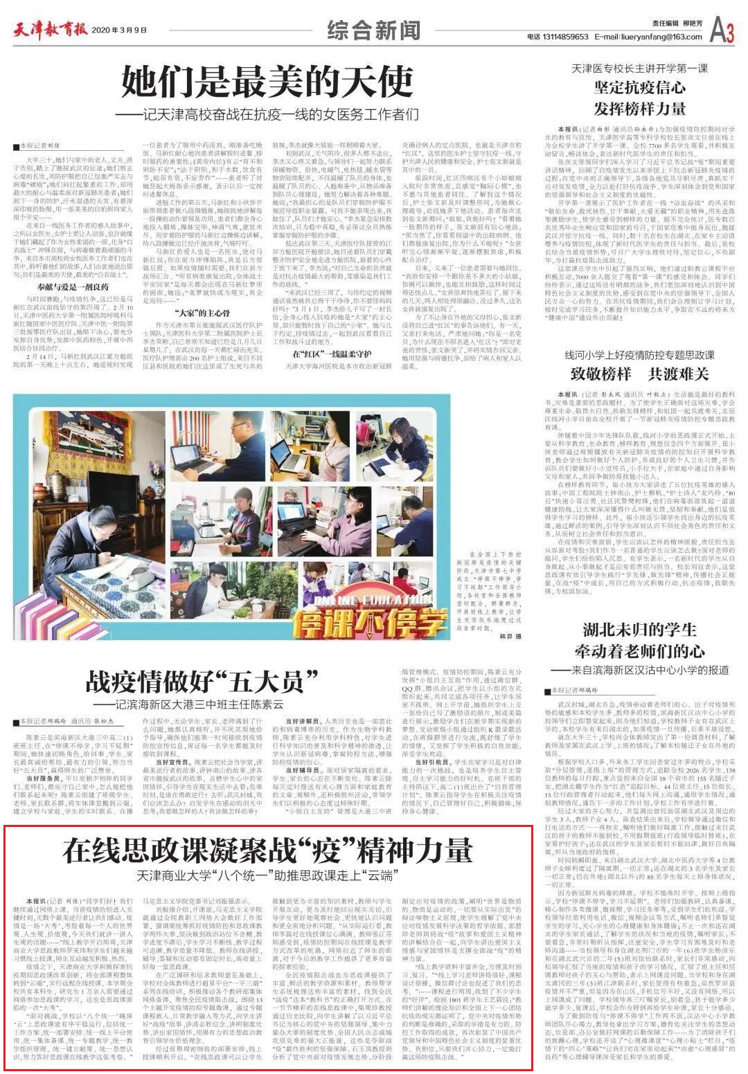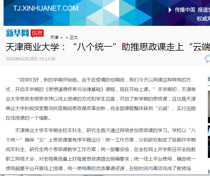 2月28日,新华网以“星空XK体育:‘八个统一’助推思政课走上‘云端’”为题报道了星空新学期思政课由于新冠肺炎疫情,积极进行课程改革创新,实行远程在线授课的情况。3月9日,《天津教育报》以“在线思政课凝聚战‘疫’精神力量”为题报道了星空马克思主义学院基于“八个统一”,助推思政课走上云端的情况。此外,津云等媒体也进行转载报道。