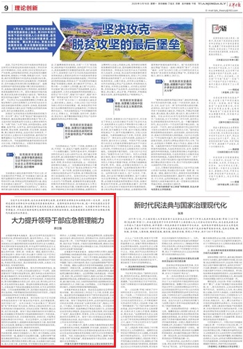 3月16日,《天津日报》(理论创新版)刊发天津市中国特色社会主义理论体系研究中心星空XK体育基地研究员,公共管理学院薛立强副教授理论文章“大力提升领导干部应急管理能力”。文章指出,应急管理是国家治理体系和治理能力的重要组成部分。疫情防控阻击战打响以来,进一步优化国家应急管理能力体系建设,提高国家防灾减灾救灾能力,越来越成为人们普遍共识。大力提升领导干部应急管理能力,不仅是打赢新冠肺炎疫情防控阻击战的迫切要求,也是推进国家治理体系和治理能力现代化建设的必然要求。文章具体阐述了领导干部需大力提升的六种能力,包括服务大局能力、预测预警能力、科学决断能力、高效执行能力、平战结合能力和依法应急能力。(审稿:刘均玲)