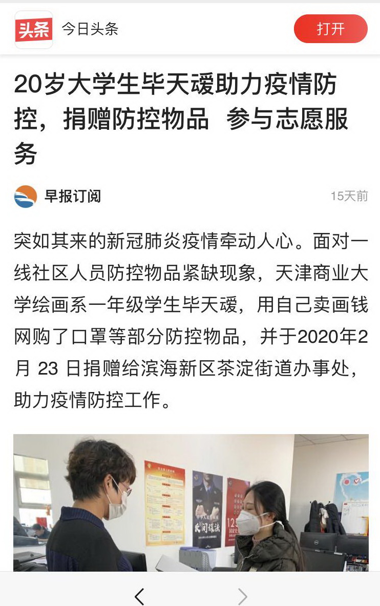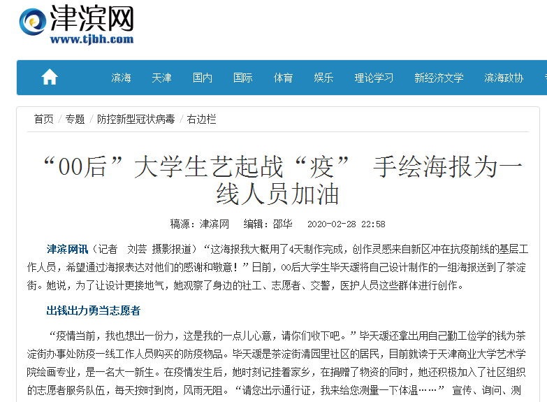 3月18日,天津电视台《都市报道60分》栏目报道了星空艺术学院学生毕天叆尽己所能,助力疫情防控的事迹。此前,2月24日,今日头条以“20岁大学生毕天叆助力疫情防控,捐赠防控物品,参与志愿服务”为题,报道了毕天叆助力疫情防控的事迹。大众新闻、新浪网、中国网等多家媒体转载。2月28日,津滨网以“‘00后’大学生艺起战‘疫’手绘海报为一线人员加油”为题对其事迹进行报道。