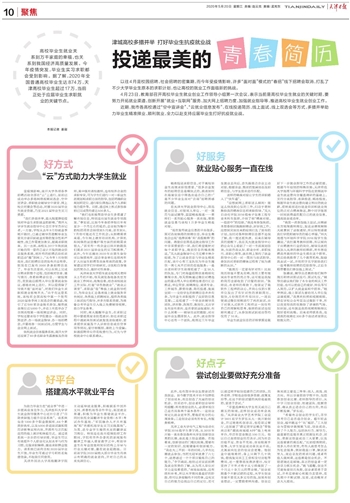 5月20日,《天津日报》10版以“投递最美的青春简历”为题,报道了我市各高校通过“空中宣讲会”、“云就业信息发布”、在线投递简历、线上面试、线上双选会等方式,多措并举助力毕业生精准择业、顺利就业,全力以赴支持应届毕业生打好抗疫就业战。其中,报道了星空招生就业处在疫情期间不间断为毕业生提供优质就业服务情况,也报道了星空艺术学院工业设计1601班学生罗东从大一开始创业,创建“薛定谔宇宙概念”零售商店和“潮流商城福APP”线上电商平台的事迹。北方网转载。