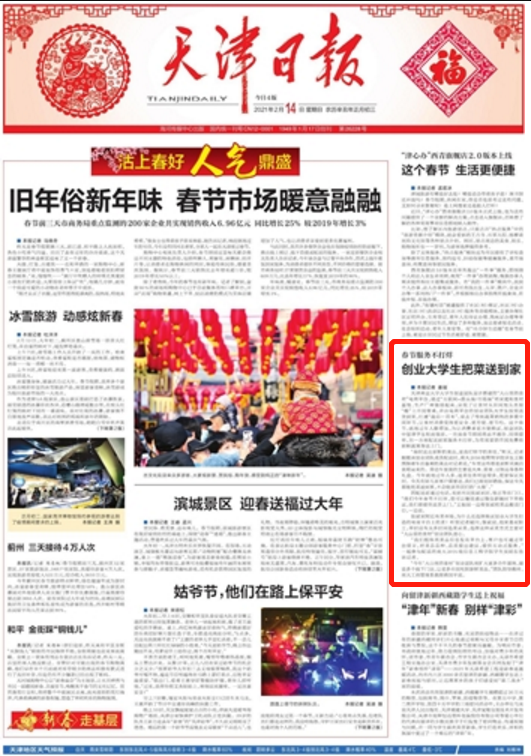2月14日,《天津日报》1版(要闻版)以“春节服务不打烊 创业大学生把菜送到家”为题报道星空学生创业团队项目“大山里的食材”电商平台。
