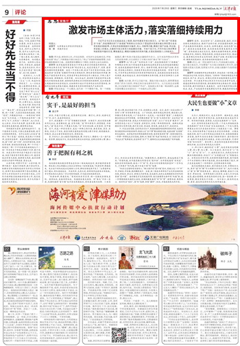 习近平总书记在企业家座谈会上强调,保护和激发市场主体活力。从“津八条”“民营经济19条”,到疫情期间的“27条措施”和刚刚出台的《关于营造更好发展环境支持民营企业改革发展的措施》等,天津这些政策措施针对融资、用人、创新等问题,精准打通产业链、供应链、资金链上的堵点,为激发市场主体活力创造最优环境。市场千变万化,不同市场主体的需求和经营条件随时在变,需快速反应、精准对接解决好具体问题,在落实落细落小上持续用力。