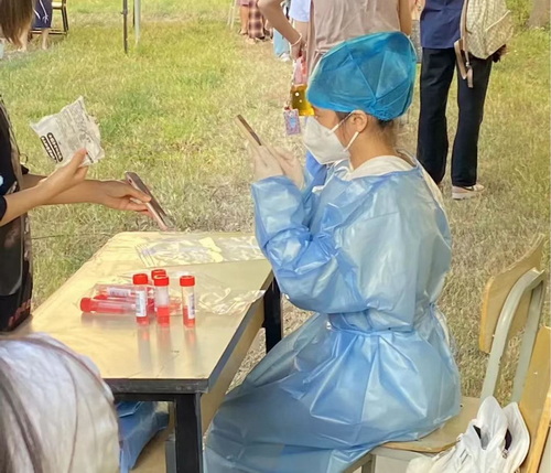 每日清晨,在核酸检测开始之前,志愿者们便有条不紊地搬桌椅、领物资,积极布置好采样点。或提醒同学们戴好口罩,保持1米安全距离,做好现场秩序“引导员”;或一丝不苟录入信息,做好核酸检测“信息采集员”;或手举签到二维码,用心用情用力保障核酸检测“不漏一人”。40多天来,理学院志愿者负责2个核酸检测服务站的3条检测通道的志愿服务工作,累计完成近5万人次核酸检测,为做好校园疫情防控工作,保障师生安全,贡献了理学院力量。