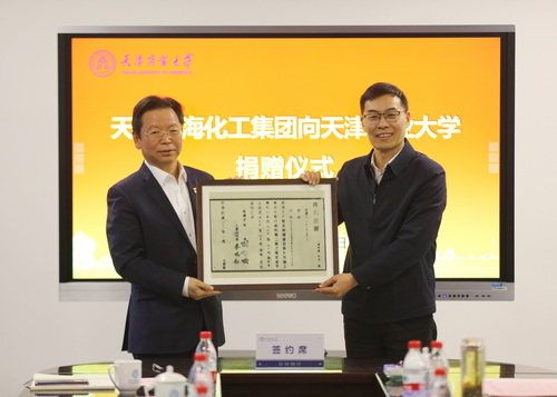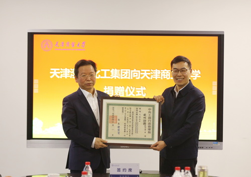 王俊明代表渤化集团将标志中华老字号历史的发明证书和专利证书拓本及贡盐砖样本捐赠给了学校。张亚代表学校向渤化集团颁发了捐赠证书。