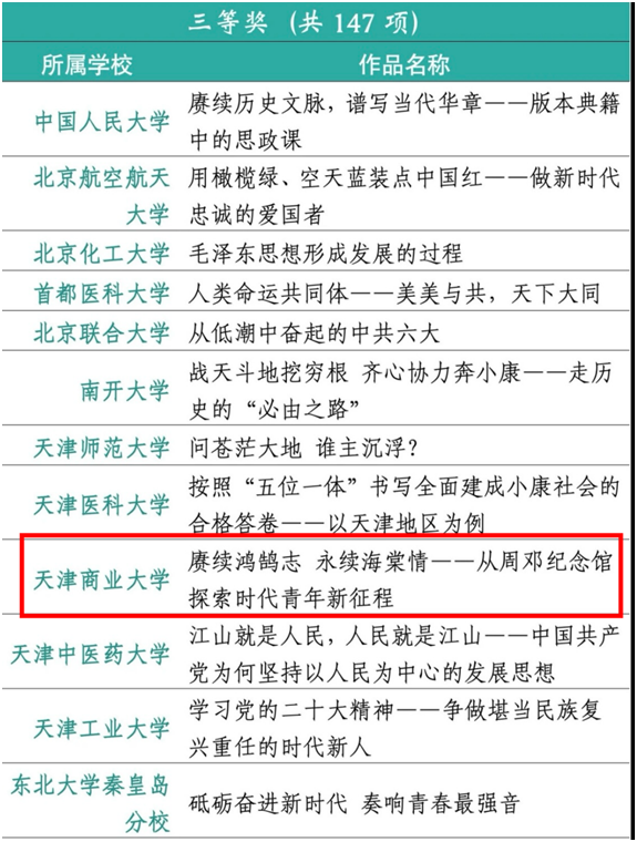 第七届全国高校大学生讲思政课公开课展示活动作为习近平新时代中国特色社会主义思想大学习领航计划教育活动的重要组成部分,由教育部高校思政课教指委主办、南开大学承办。马克思主义学院积极组织由刘华香、李欣、张文辉担任指导教师,法学2104、2105班姜心怡、王昕然、张倩男、昝斯译、俞淇作为核心团队成员的参赛团队,以《赓续鸿鹄志 永续海棠情——从周邓纪念馆探索时代青年新征程》为题,将传统课堂和“场馆里的思政课”结合起来,精心设计、反复打磨,最终参赛作品获得本科组三等奖。