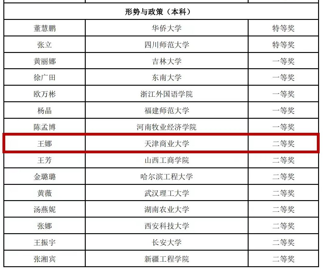 全国高校思想政治理论课教学展示活动由教育部社科司组织主办,由各省市教育行政主管部门遴选,报名参赛通过形式审查的思政课教师达到 717人。经市教育两委遴选,王娜、刘文佳分别代表天津市参加“形势与政策”、研究生“新时代中国特色社会主义理论与实践”两门思政课的教学竞赛,与全国思政课教师同台切磋交流。马克思主义学院高度重视此次展示竞赛,在市教育两委统一指导下,组织参赛教师参加“云上大练兵”,与全国高校思政课名师工作室“一对一”进行帮扶,与教务处共同组建专家指导团,指导参赛教师撰写学情分析报告、创新教案,制作创新课件,录制说课视频,参加网络展示评审。在现场教学展示环节,两位教师展现出深厚的教学功底,讲出了思政课立德树人的高度、温度和深度,赢得评委认可,最终获得佳绩。