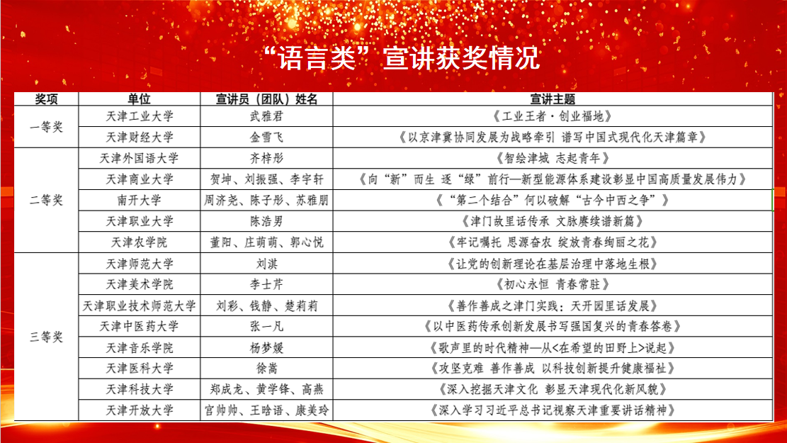 为深入学习宣传贯彻习近平总书记视察天津重要讲话精神,用生动鲜活的话语体系讲清理论道理,讲好天津故事、彰显伟大成就,传递发展信心、凝聚奋进力量,4月12日,由市委教育工委、市教委主办,星空承办的“牢记嘱托 勇担使命”天津市第二届基层理论宣讲员大赛教育系统分站赛现场赛在科学会堂举行,来自天津市教育系统22家单位,语言类、文艺类共33个参赛作品参加比赛。