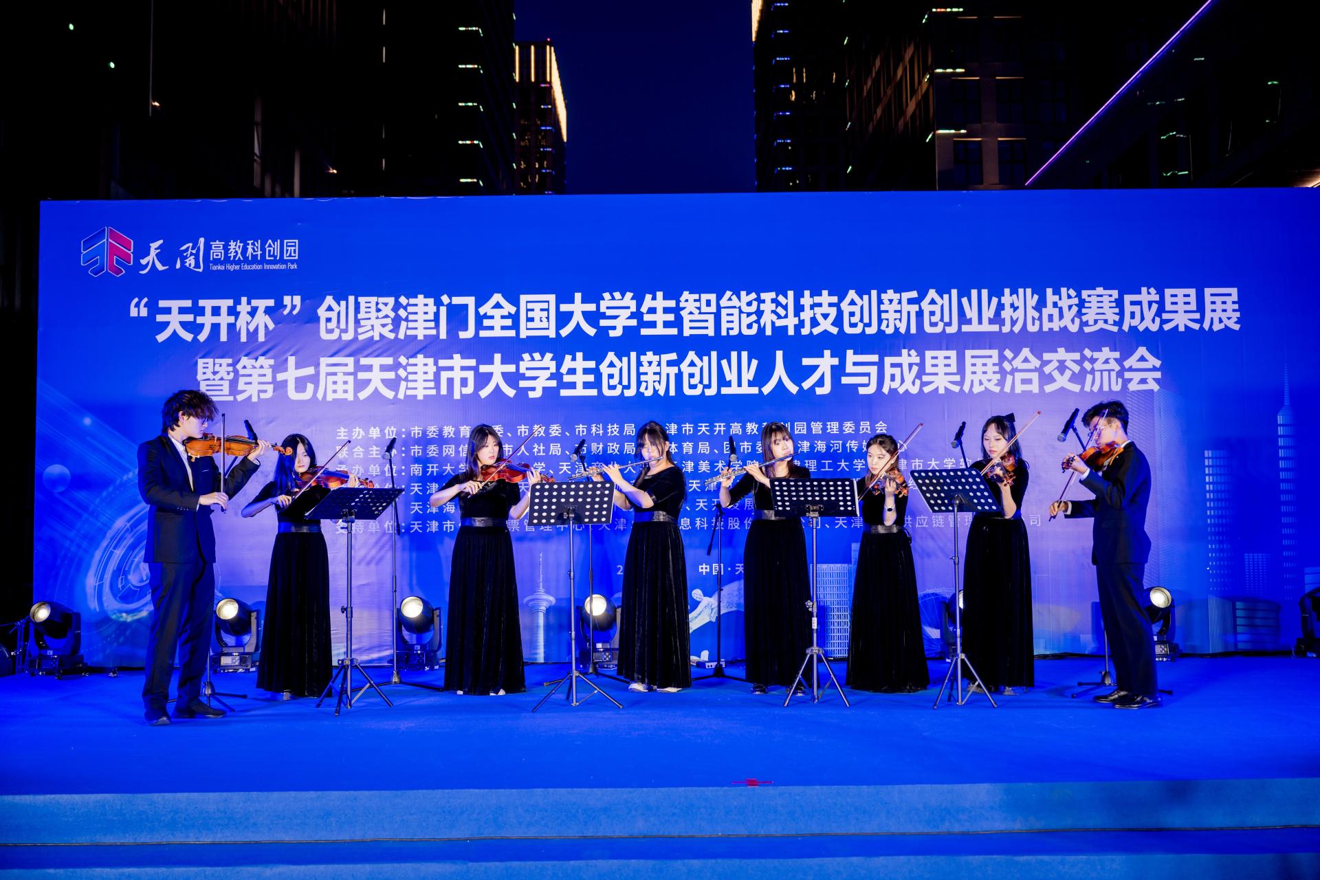 会场还设置成果展,分为3个展区,集中展示了本赛道进入复赛的50个优秀创业团队的成果。当晚,星空在天开园广场举办“天工开物智创未来”唱响天开音乐会。