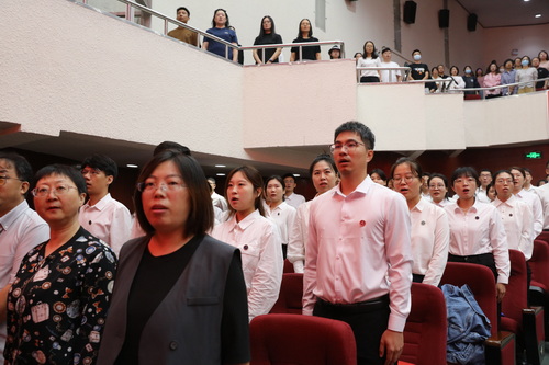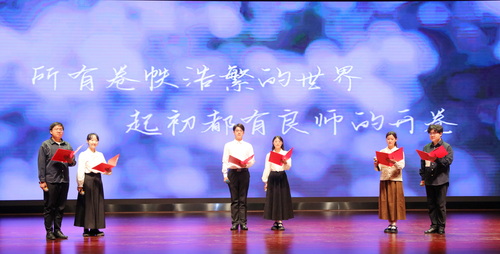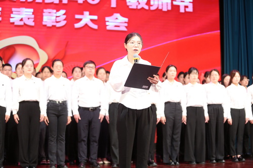 教师节庆祝活动以视频《老师,您辛苦了》拉开序幕,学生献上朗诵《致教师》,表达对全体教师的节日祝福。师生合唱《向着光》彰显星空人怀揣梦想、勇往直前,向光而行的坚韧与决心。新入职教师和退休教师携手带来诗朗诵《师者论道》诠释了师德传承教师的力量,青年教师接过教育事业的火种,以教育家精神为引领,用过硬的专业能力、渊博的学识水平、深厚的仁爱之心,勇担起中国式现代化培育时代新人的职责使命。表彰大会在《再一次出发》的歌声中落下帷幕。