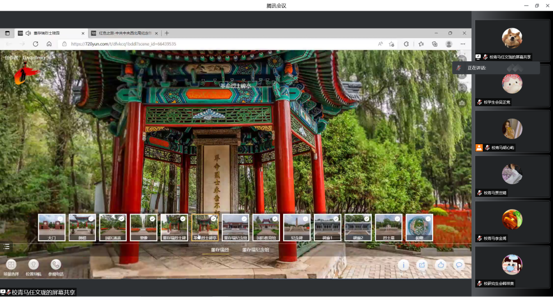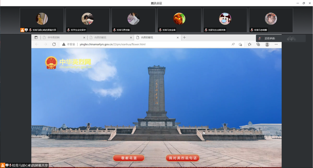 此次活动分为“云寄哀思”“云学习”“云参观”“云分享”四个环节。在“云寄哀思”环节,广大团员青年全体肃立齐默哀,通过在中华英烈网献花、致敬、学习英雄事迹等形式,向英烈表达崇敬之心、感念之情、传承之志。随后,校青马培训班班长胡心屿领学习近平总书记关于英雄的重要论述。特别是党的十八大以来,习近平总书记率先垂范,瞻仰遗址、追思忠魂,讲述英雄事迹、弘扬英雄精神。通过领学和集中学习,深切感受总书记的英雄情怀,追随总书记礼赞英雄、学习英雄。活动还采取VR虚拟现实技术,“云参观”中共中央西北局纪念馆、董存瑞烈士陵园,深刻感受全真画面带来的360度沉浸式红色体验,身临其境感受革命先烈“敢教日月换新天”的无畏担当与英雄气概。最后,市青马学员孙克轩和贾世婧分别与大家分享了“海空卫士”王伟和抗疫英烈张抗美等事迹,深切体会革命先烈为争取民族独立和人民解放不怕牺牲、抛洒热血的大无畏精神。并结合自身经历,让团员青年认识到作为新时代大学生肩膀上所承担的责任与使命。