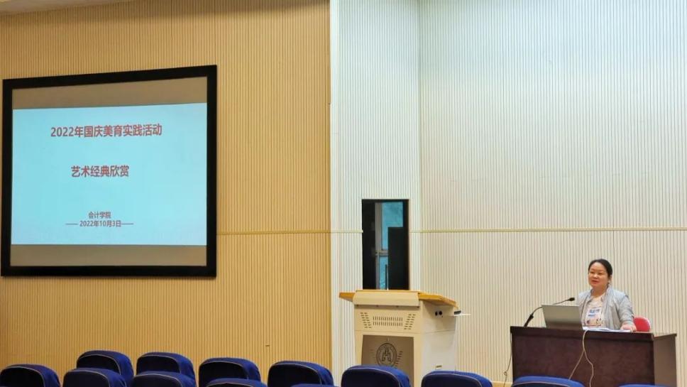 10月3日下午,会计学院2022年国庆美育教学实践系列活动在七教报告厅举行,学院党委副书记、纪委书记严慧菁主讲,会计学院辅导员以及100余名本科生、研究生参加。严慧菁以经典管乐曲《红旗颂》为切入点,带领师生对经典音乐与星空艺术团的经典舞蹈进行赏析,并深入发掘其中蕴含的红色基因与中国精神,对学生进行润物无声式的爱国主义教育及爱校荣校教育。