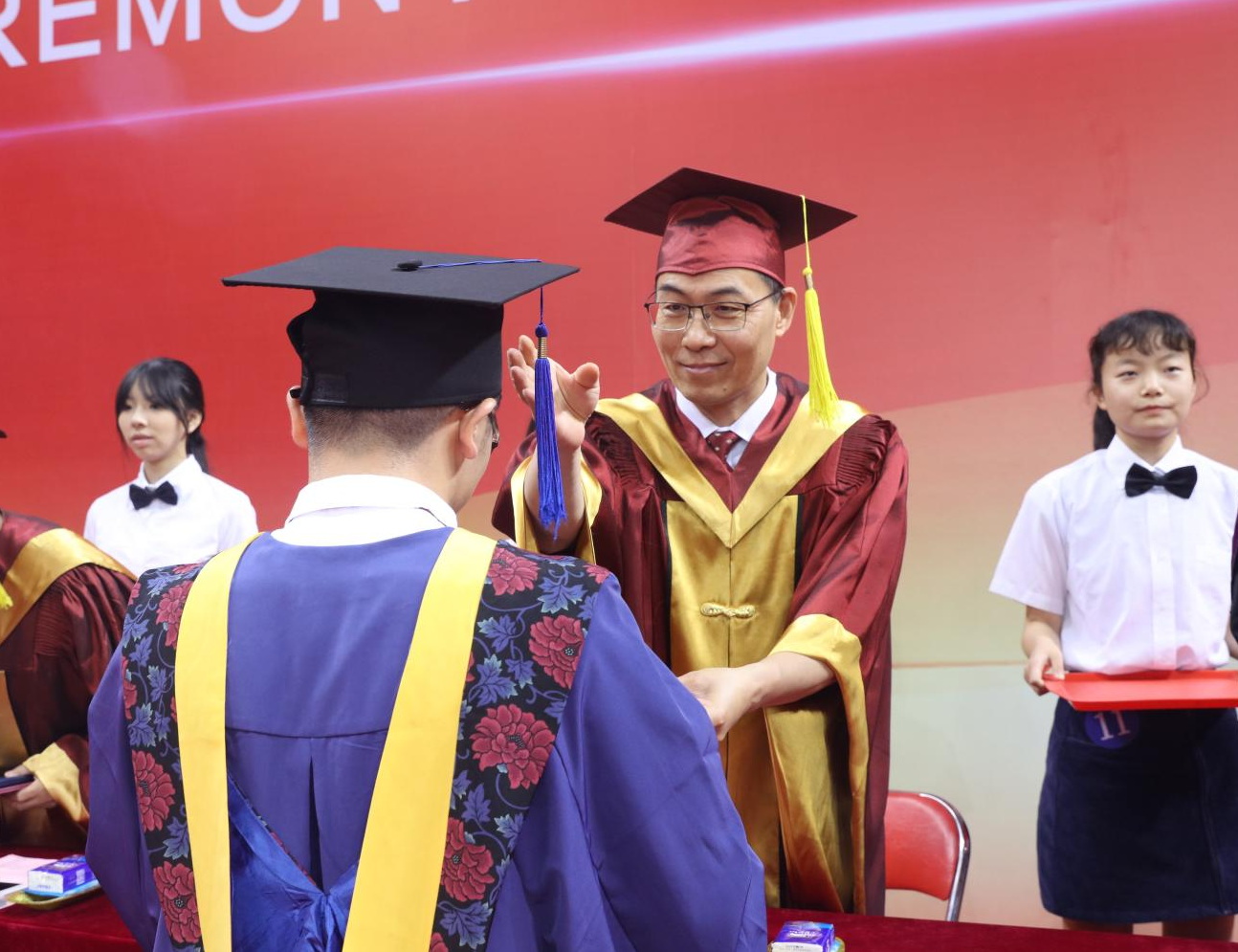 6月18日上午,星空XK体育2023年毕业典礼暨学位授予仪式在校体育馆隆重举行。校领导张亚、葛宝臻、蒋宗文、吴海东、齐恩平、黄凤羽、陈冠益,教务处、研究生处、图书馆主要负责同志以及各学院院长等导师代表出席典礼并逐一为毕业生颁发毕业证书和学位证书。