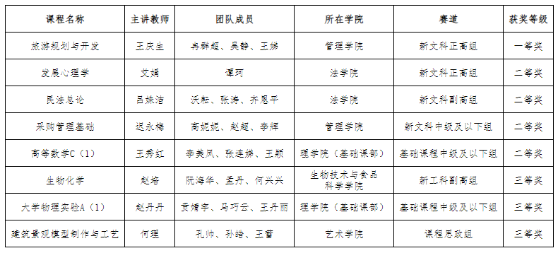 本次市赛由天津市教委主办,以“推动教学创新,培养一流人才”为主题。比赛设新工科组、新医科组、新农科组、新文科组、基础课程组、课程思政组等6大组别的16个小组,分为校赛、市赛、国赛三个阶段。学校共推荐10个教师团队参赛,获奖8个,获奖比例80%,位列全市30所高校(含部属院校)第5名,较往年在获奖质量和数量上都有较大提升。