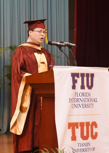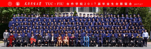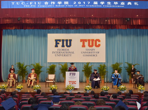 5月7日上午,TUC-FIU 合作学院酒店管理专业2017 届学生毕业典礼暨美国佛罗里达国际大学酒店管理理学学士学位授予仪式在科学会堂举行。校长葛宝臻、佛罗里达国际大学校长Mark B.Rosenberg、天津市旅游局副局长何智能出席并讲话。典礼由院长孙钰、佛罗里达国际大学酒店管理学院院长Mike Hampton 共同主持。双方专业教师、管理人员、204名毕业生以及80余位学生家长参加。