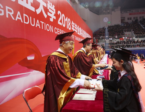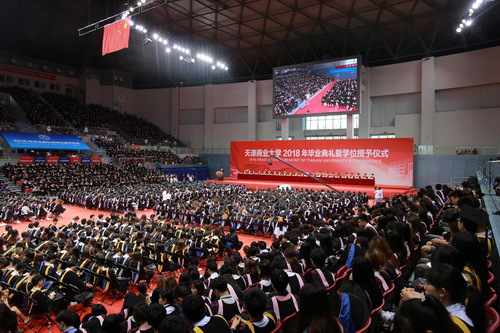 副校长、校学位评定委员会副主席齐恩平宣读毕业生毕业及授予学位的决定。曾担任大学生村官的马克思主义学院研究生李志青,保送北京大学硕士研究生的外国语学院本科生张甜甜,曾在中国人民解放军北海舰队服役两年、考取天津大学硕士研究生的信息工程学院本科生张世崇,留校从事少数民族辅导员工作的生物技术与食品科学学院本科生努尔比耶姆·麦麦提代表2018届毕业生发言,感谢学校的悉心培养,感恩老师的辛勤付出,畅谈了对实现未来美好生活的信心和决心。