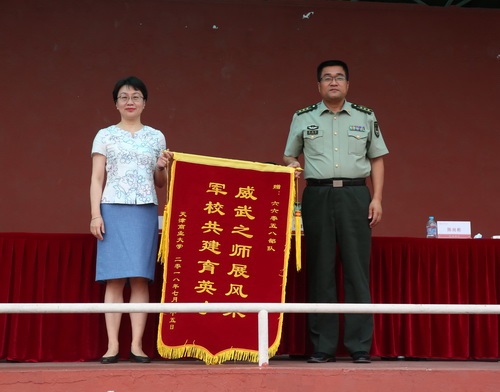 史习红向承训部队赠送“威武之师展风采、军校共建育英才”的锦旗,希望进一步加强军校共建,培养新时代中国特色社会主义建设者和接班人。