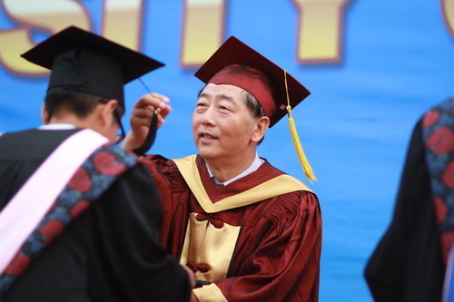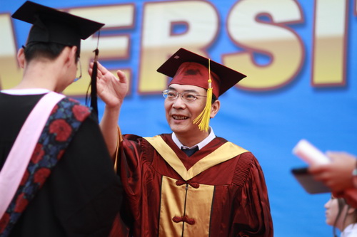 校党委书记陈学奇为2012届毕业生颁发毕业证学位证并拨流苏