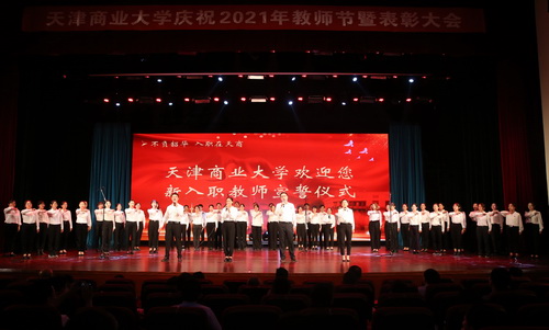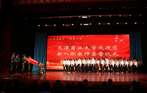 荣获省部级荣誉称号的专家为新入职教师代表佩戴校徽,全体新入职教师面对国旗庄严宣誓。优秀教师代表公共管理学院杜凤霞、新入职教师代表生物技术与食品科学学院张宏扬作交流发言。