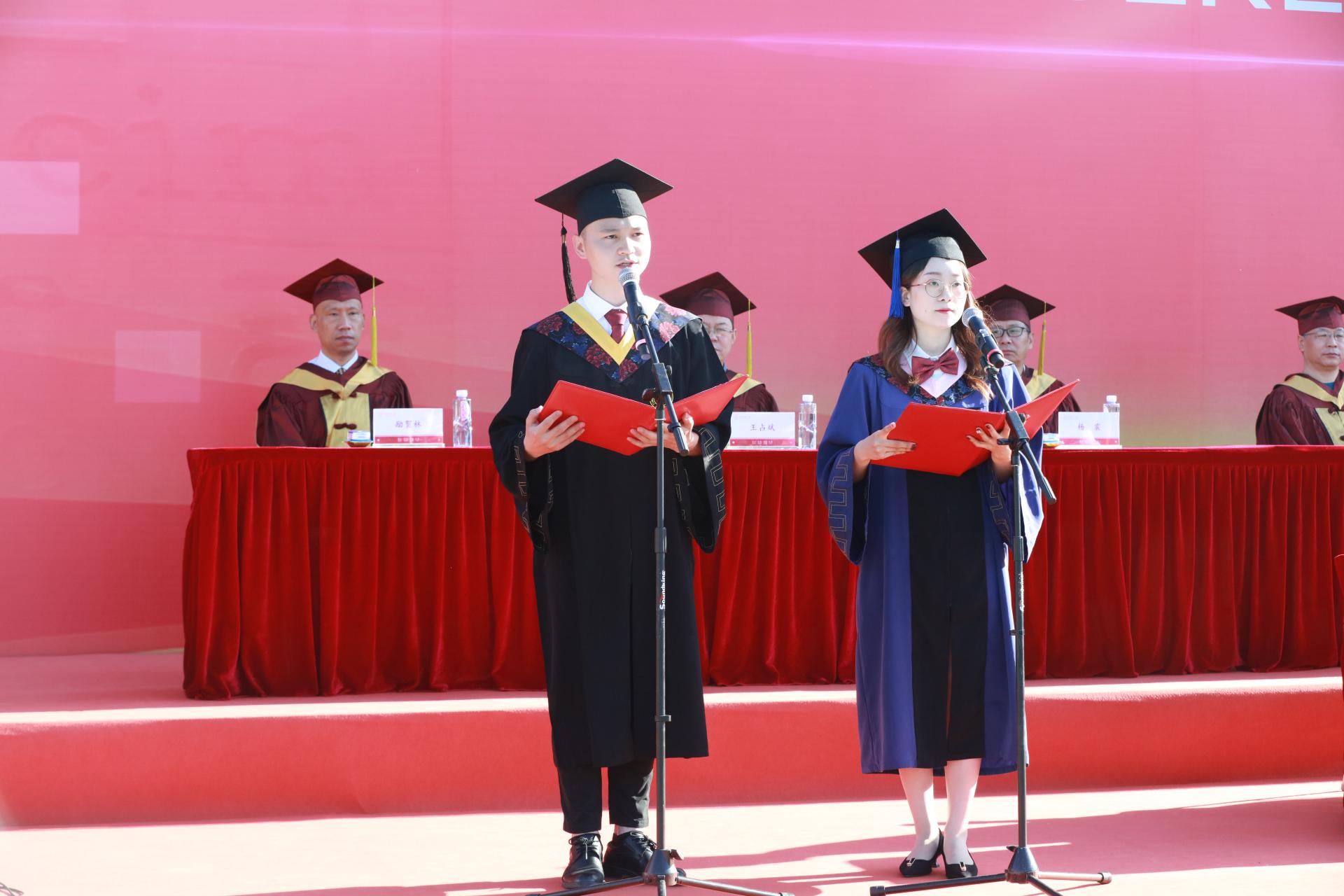 副校长齐恩平宣读毕业生毕业及授予学位的决定。经济学院优秀硕士毕业生张献和信息工程学院优秀本科毕业生李美盛代表2021届毕业生发言,分享了大学生涯的收获和感悟,深情感恩母校的悉心培育和师长们的谆谆教诲,表达了对未来取得更好成绩的信心和决心。