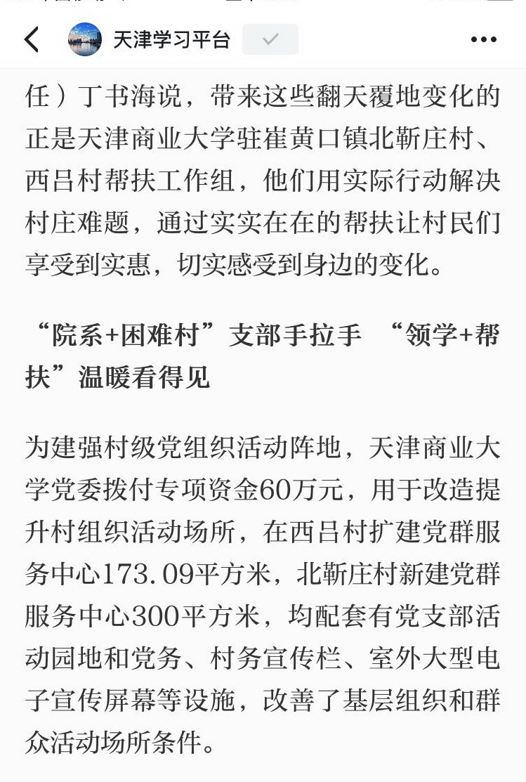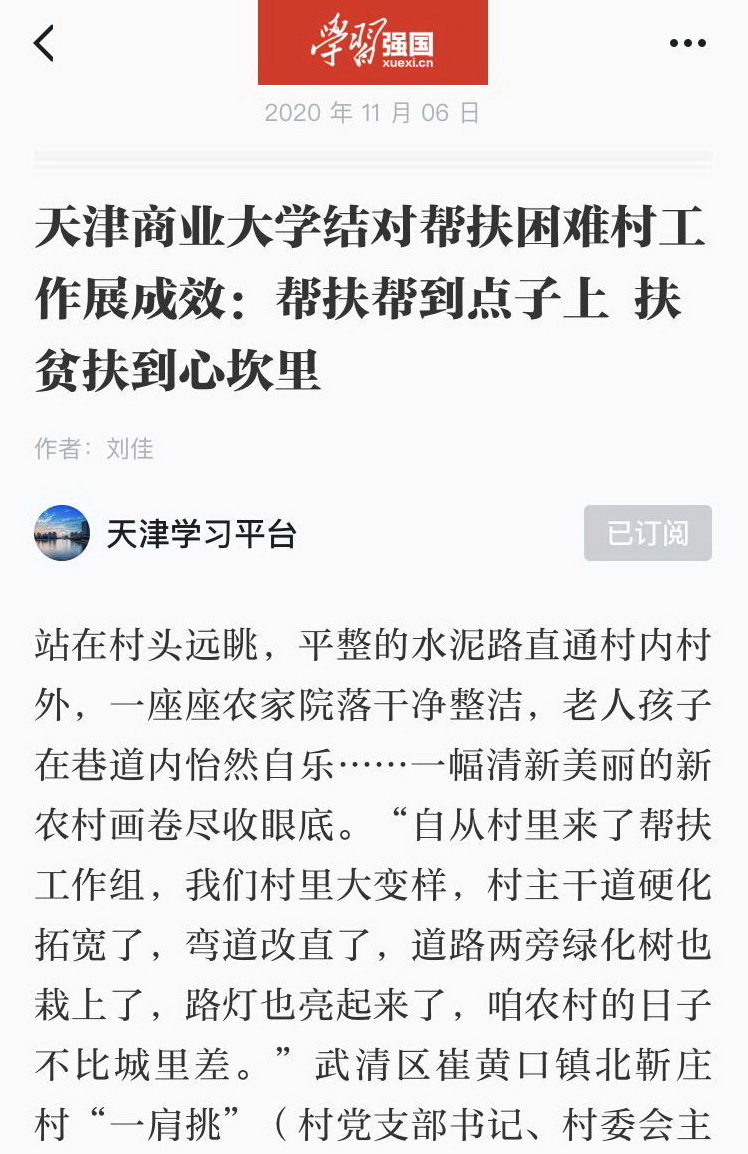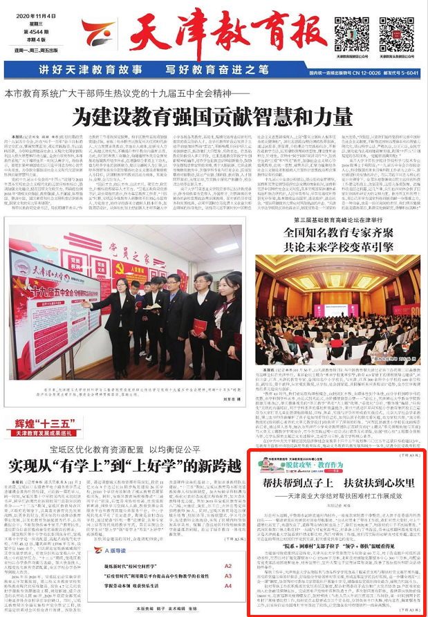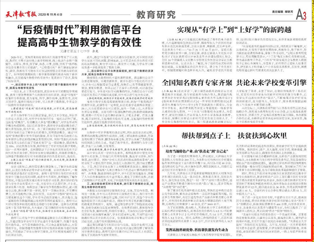 11月4日,《天津教育报》1版“脱贫攻坚•教育作为”专栏以“帮扶帮到点子上 扶贫扶到心坎里”为题报道了星空结对帮扶困难村工作开展成效。11月6日,学习强国对《天津教育报》报道进行全文转载。