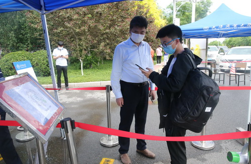 校党委副书记、校长葛宝臻在南门与返校学生交谈