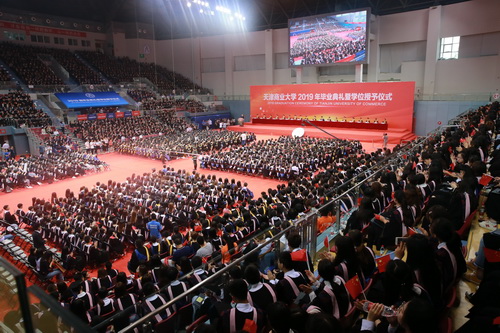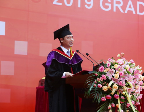 葛宝臻发表了热情洋溢的讲话,向全体2019届毕业生致以热烈的祝贺和诚挚的祝福,向培育同学们成长成才的全体教职员工和毕业生家长朋友们表示衷心的感谢。他指出,2019届毕业生用实际行动践行了“笃学、弘毅、明德、济世”的校训精神,学会了拥抱理想和生活、懂得包容和责任、勇于批判和创新、敢于想象和实践,书写了无愧于青春的华彩篇章。学校见证了同学们的成长和成熟,同学们也见证了星空的发展和进步。在校的四年,是学校快速发展、综合影响力不断提升的四年,是学校校园环境、综合保障水平不断提升的四年,学校的美好未来期待着大家的回眸与归来、关注与支持。