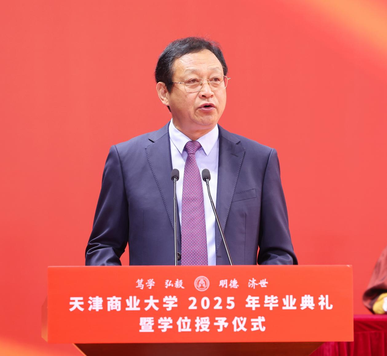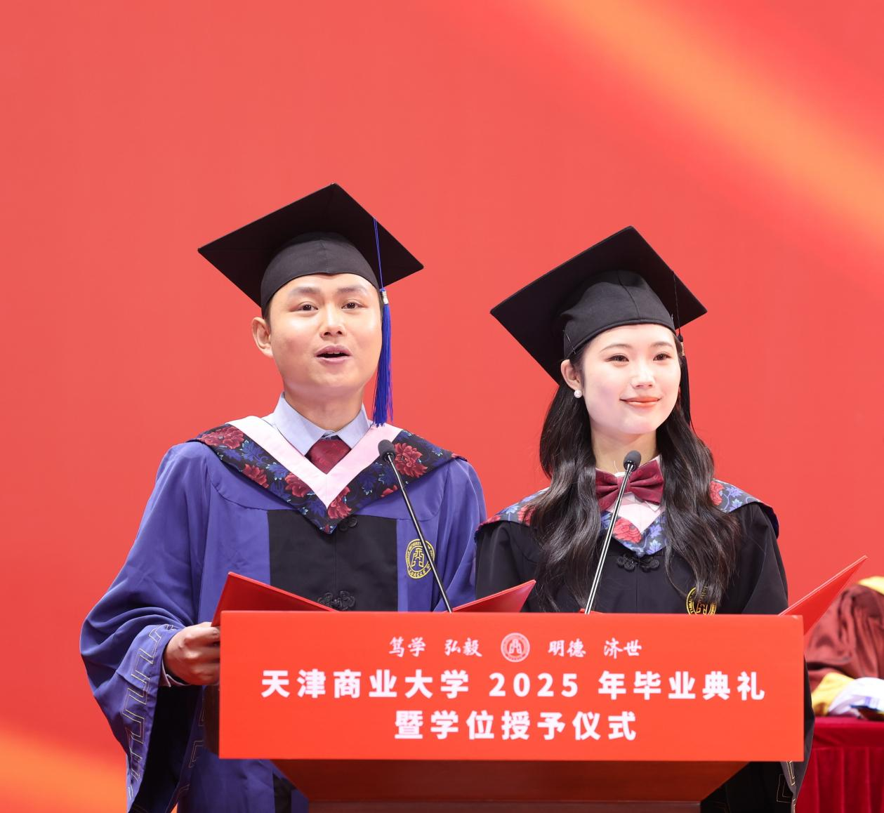 副校长齐恩平代表校学位评定委员会宣读2025届毕业生毕业及授予学位的决定。1989届制冷及食品冷冻工程专业毕业生、全国劳动模范、冰轮环境技术股份有限公司党委书记、董事长李增群作为校友代表分享了自己宝贵的人生经验,勉励毕业生要永葆爱党爱国的情怀,树立生涯规划的意识,养成终身学习的习惯,怀揣干事创业的激情,用奋斗创造幸福。即将投身国防事业的公共管理学院优秀硕士毕业生谢儒鹏、继续前往东华大学求学深造的会计学院优秀本科毕业生蔡雪阳代表2025届毕业生发言,分享了各自在校期间的成长感悟,见证了学校近年来日新月异的发展变化,表达了对母校悉心培育、师长谆谆教导、同窗浓厚情谊的不舍与感恩之情。