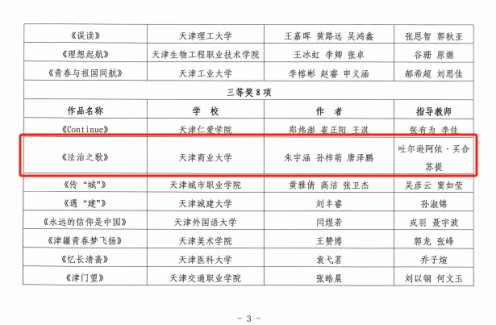 日前,市委教育工委、市教委公布了2024年天津市“牢记嘱托 奋楫笃行”原创思政音乐作品征集活动评奖结果,星空法学院2023级本科生朱宇涵、唐泽鹏、孙梓萌制作的音乐作品《法治之歌》荣获大学组三等奖,指导教师为法学院辅导员吐尔逊阿依·买合苏提。