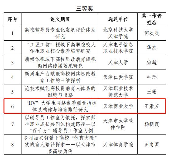 近日,市教育两委公布2024年度天津市高校辅导员工作优秀论文评审结果,经济学院桑振龙老师撰写《新时代高校构建“三信·四纵·五横”时代新人培养体系路径研究》论文获一等奖、理学院王素芳老师撰写《“IIV”大学生网络素养测量指标体系构建与培育路径研究》论文获三等奖。