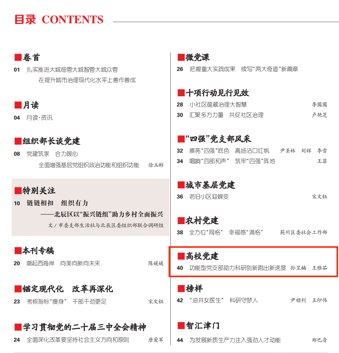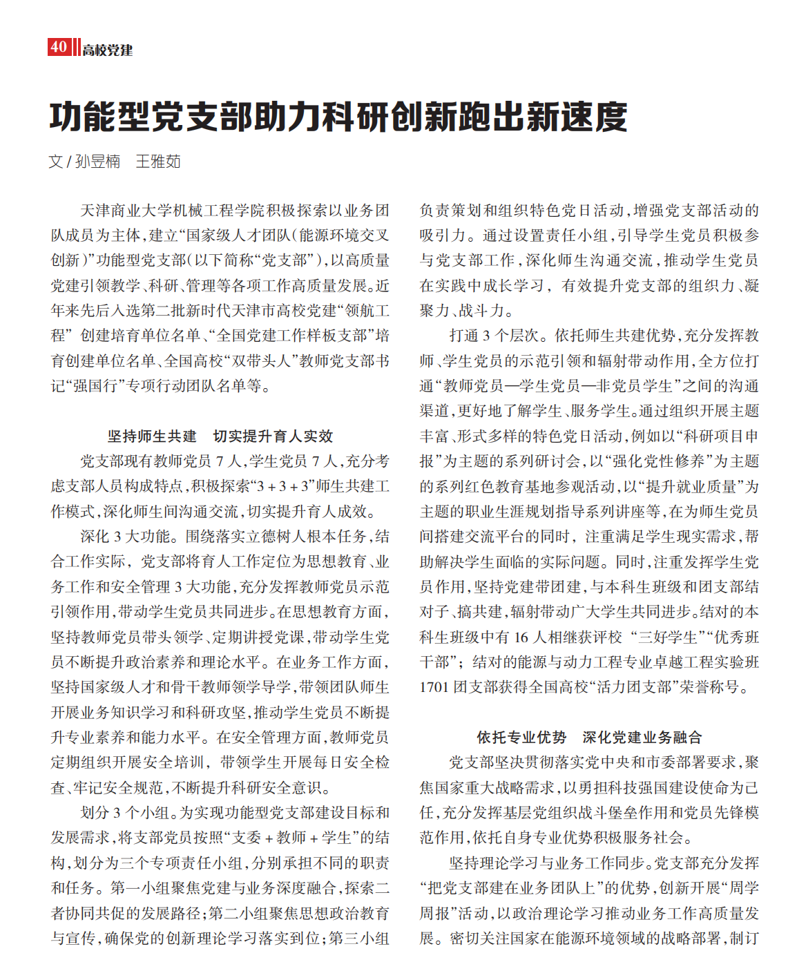 创新驱动,党建赋能。多年来,星空XK体育坚持落实立德树人根本任务,不断探索党建与业务深度融合的新路径,以高质量党建引领教学、科研、管理等各项工作高质量发展。近日,《天津支部生活》杂志“高校党建”专栏发表星空孙昱楠和王雅茹老师联合撰写的,题为“功能型党支部助力科研创新跑出新速度”的文章,详细介绍了星空机械工程学院“国家级人才团队(能源环境交叉创新)”功能型党支部成立以来在支部管理模式、与业务融合方面的创新做法和显著成效。