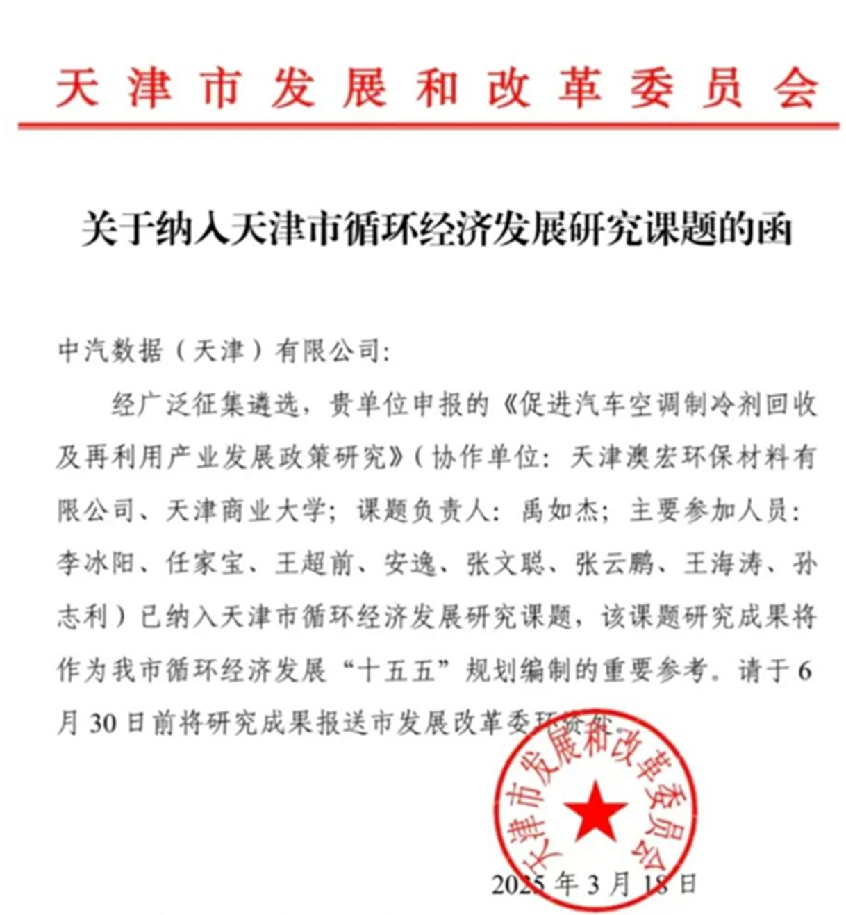 经广泛征集遴选,由中汽数据(天津)有限公司、天津澳宏环保材料有限公司、星空XK体育联合申报的《促进汽车空调制冷剂回收及再利用产业发展政策研究》(课题负责人:禹如杰;主要参加人员:李冰阳、任家宝、王超前、安逸、张文聪、张云鹏、王海涛、孙志利)已纳入天津市循环经济发展研究课题,该课题研究成果将作为我市循环经济发展“十五五”规划编制的重要参考。