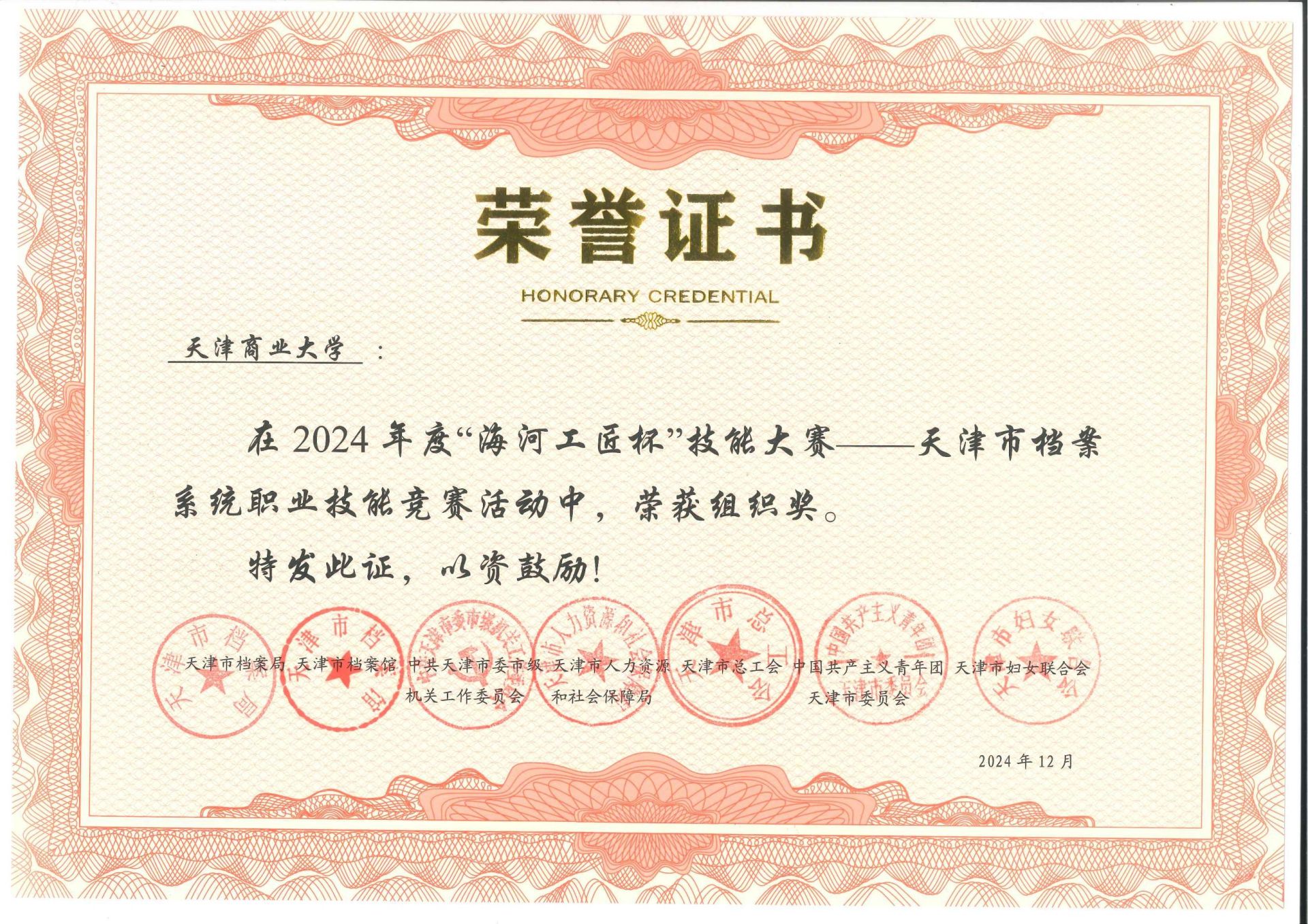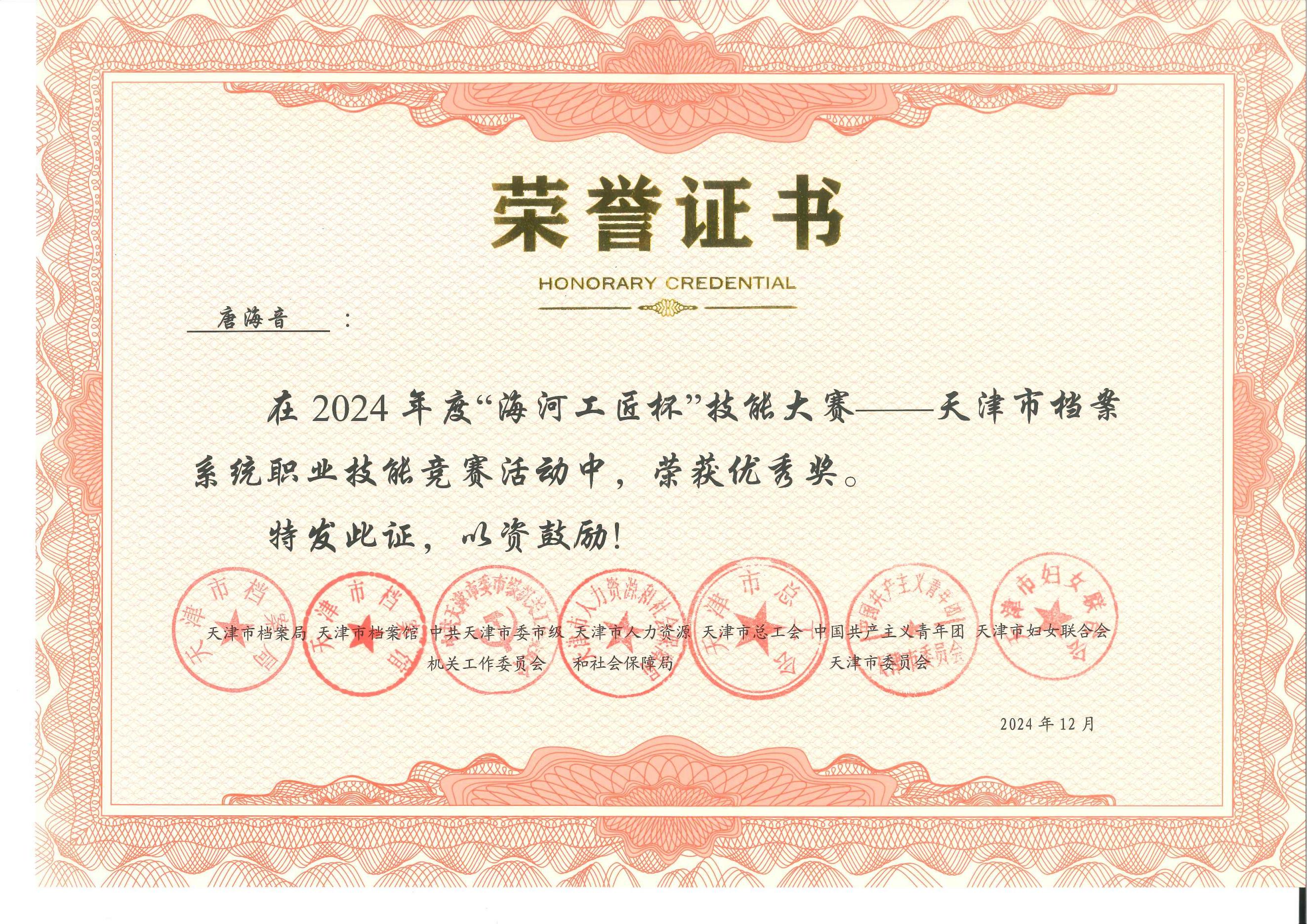 近日,由市档案局、市档案馆、市委市级机关工委、市人社局、市总工会、团市委、市妇联共同主办,市北方人才培训中心、北方测评(天津)人才发展有限公司承办的2024年度“海河工匠杯”技能大赛——天津市档案系统职业技能竞赛圆满落幕。经过初赛和决赛的层层筛选,代表星空参赛的人事处唐海音获得优秀奖,学校获组织奖。