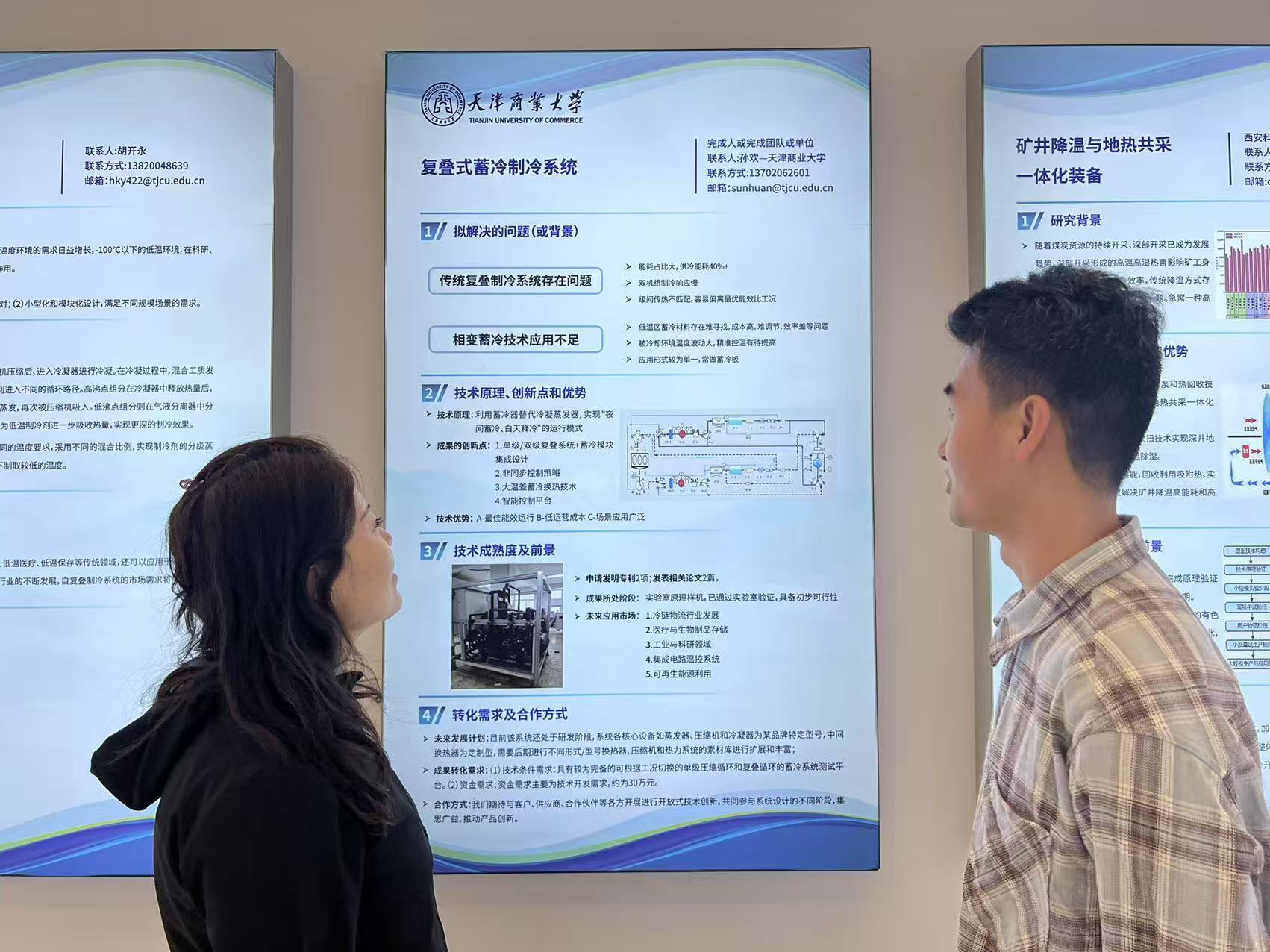 在路演专区的技术路演板块,共有来自17所高校、研究院所的50个项目以“海报+实物”的形式展出,其中星空刘斌教授的“多物理场耦合保鲜舱”、胡开永副教授的“基于物理模型和大数据的制冷系统设计软件”、赵松松副教授的“基于平行板电容器原理的智能除霜控制研究”等12个项目入选。在此基础上,从50个项目中进一步遴选出20个项目在路演专区面向企业组织宣讲会,孙欢教授级高级工程师的“复叠式蓄冷制冷系统”、代宝民教授的“小型制冷装置部件及系统仿真软件开发”2个项目成功入围宣讲会。星空参展的科技成果,集中在工业及商用制冷及相关部件,压缩机、换热器、阀件与其他辅助部件,空气处理、控制设备与系统,应对气候变化及其他产品技术4个方向。