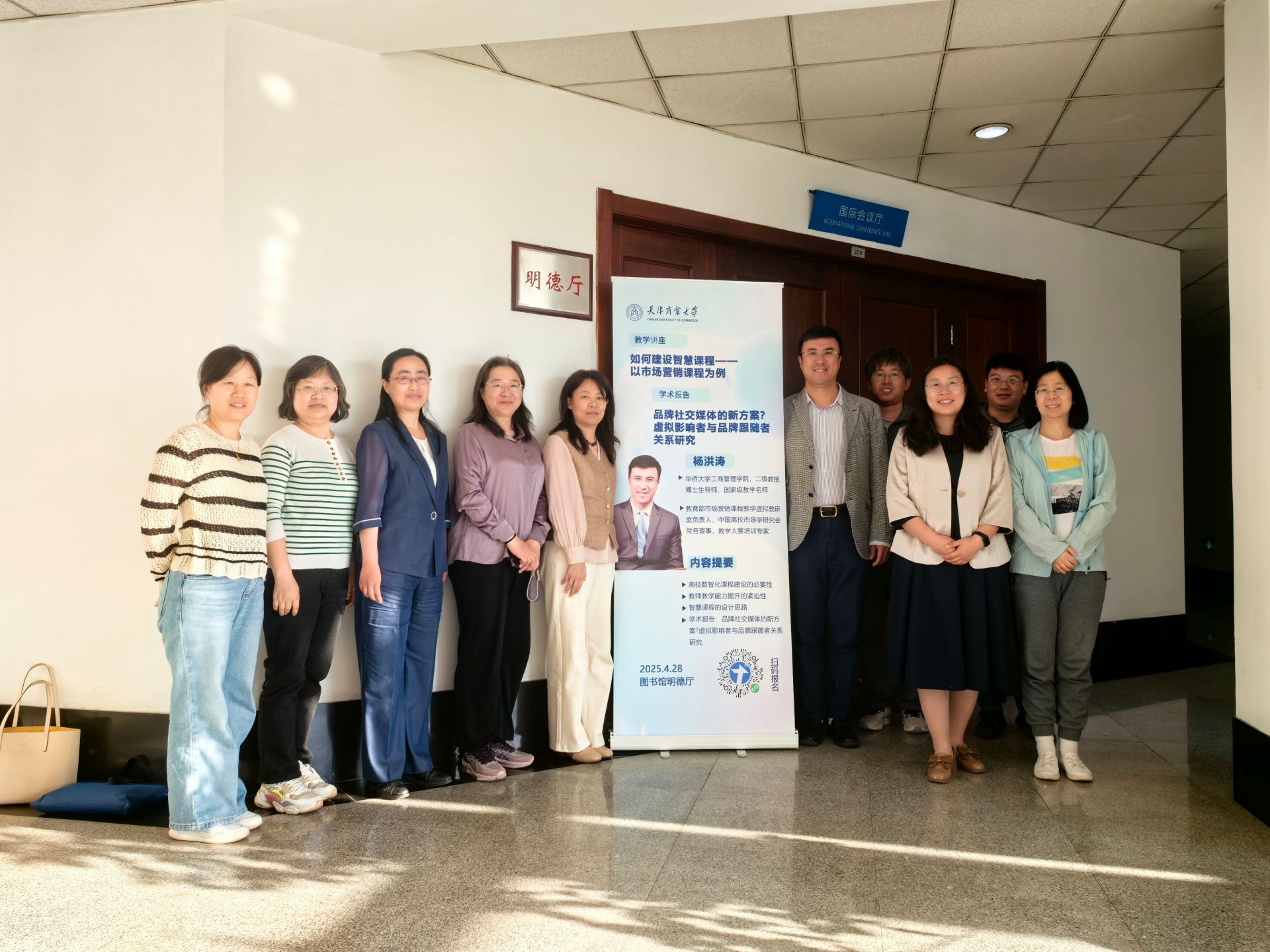 活动分为两个环节,一是学术报告,报告题目为“品牌社交媒体的新方案?虚拟影响者与品牌跟随者关系研究”;二是教学讲座,讲座题目为“如何进行数智化课程建设”。